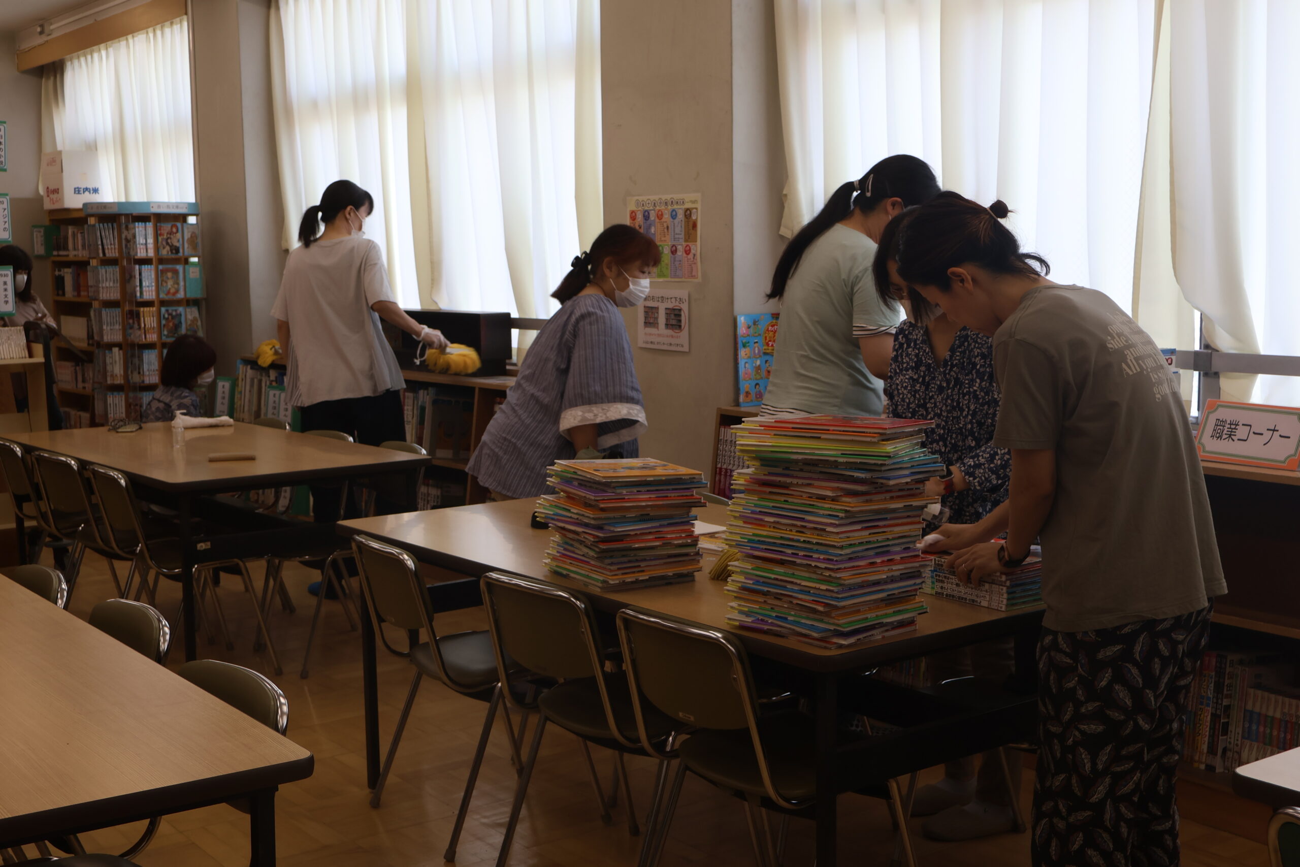 現在、学校応援団の図書ボランティアは10人いらっしゃり、卒業生のママさん達で行ってます。そこへ、年に4回〜5回程度「成人委員」より図書整理のため活動に入ってます。また、数年前より司書さんが月1・2回、巡回で来ていただいております。