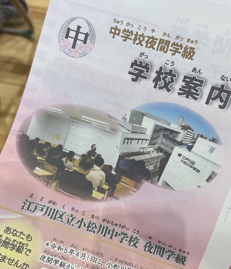 今年度のテーマは、新設されたばかりの校舎を持つ小松川中学校にて、区内唯一設定されている「夜間学級」でした。校舎見学や副校長先生による「夜間学級」の仕組みや運営の流れをお伺いすることができました。