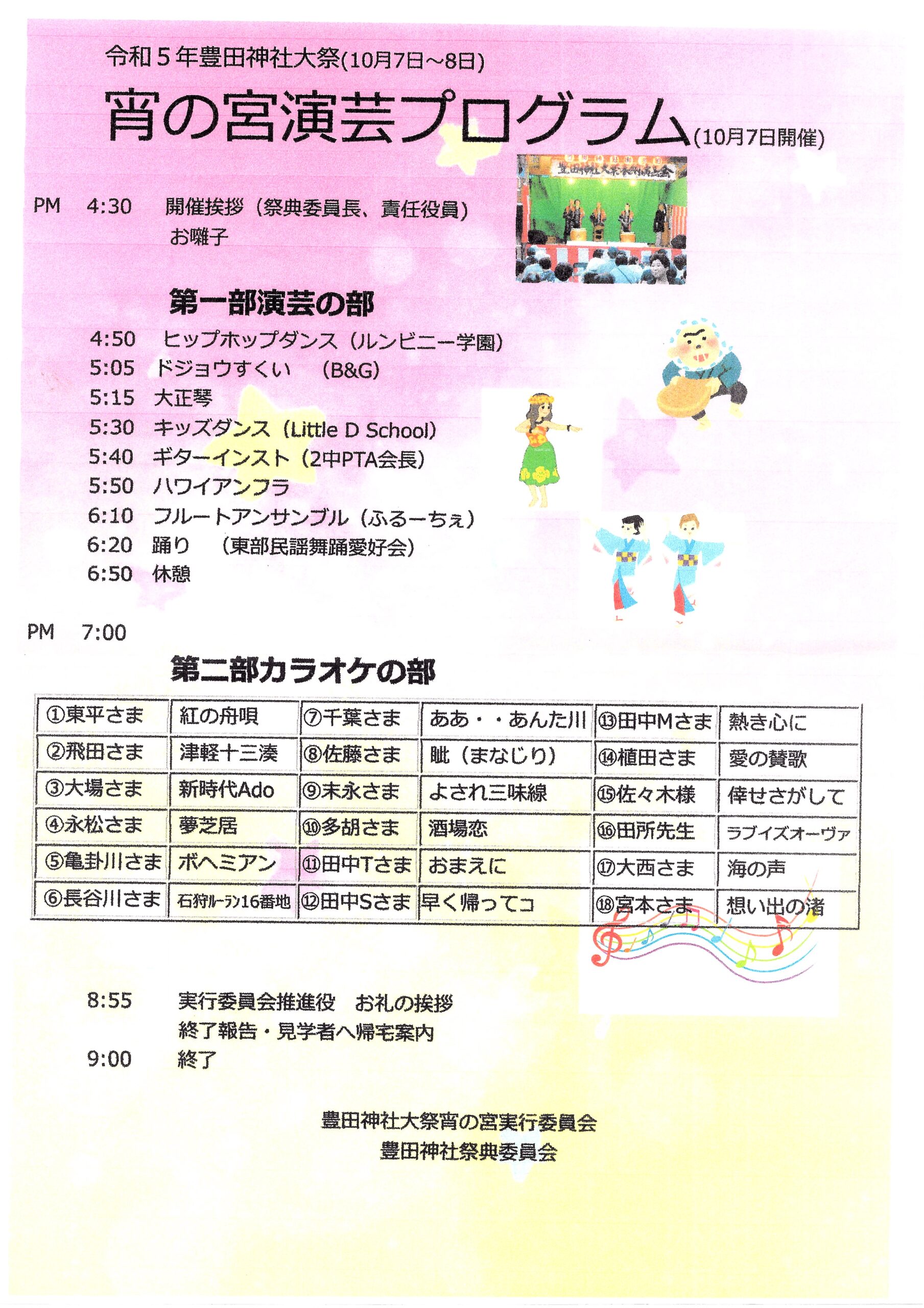 4年に一度の豊田神社大祭の中で行われる「宵の宮」に瑞江二中PTAとして、出演させて頂きます。