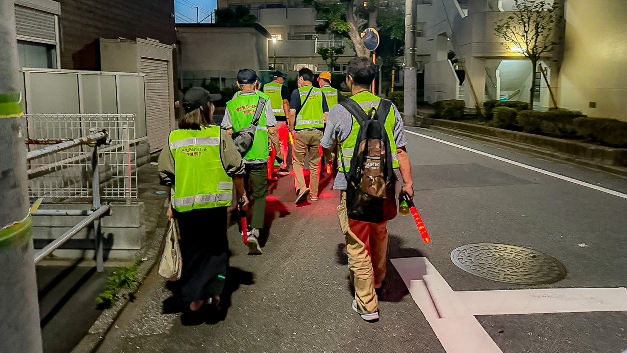 その後、3つのグループに分かれ、赤色灯とベストを借りて、内手の庭エリアをパトロールしました。夜は比較的涼しく、負担が少ない活動です。