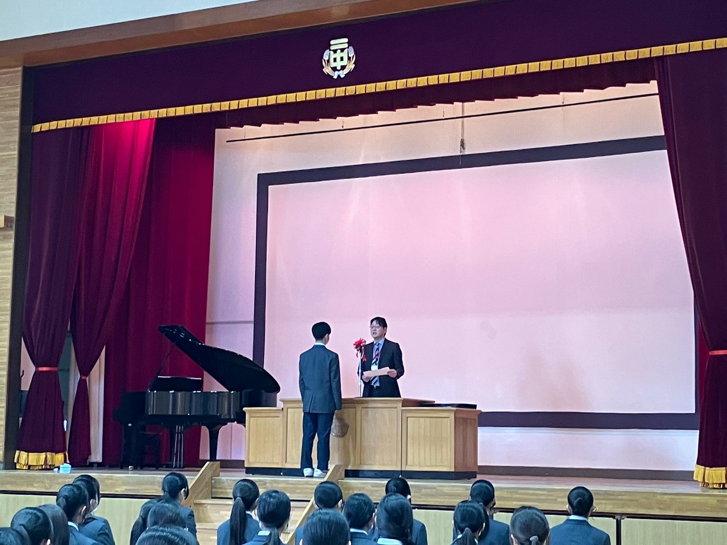 会長と卒業対策委員長が壇上にがり「卒業記念品 贈呈式」にて、記念品を贈呈しました。