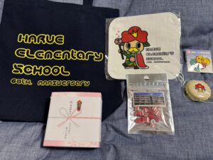 ※60周年お祝いの品として、エコバック、ハンドタオル、付箋紙、飴、お祝いのどら焼きをいただきました。